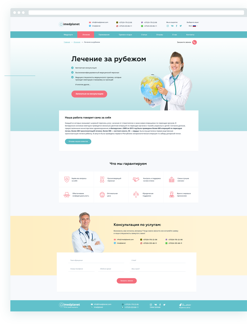The page "Services" is exactly what users are looking for, so we paid special attention to its development. The page contains important information, divided into logical blocks, between which unobtrusively implemented buttons to order a call and make an appointment. Only the most necessary for the user to make an informed choice and become a client of the company.